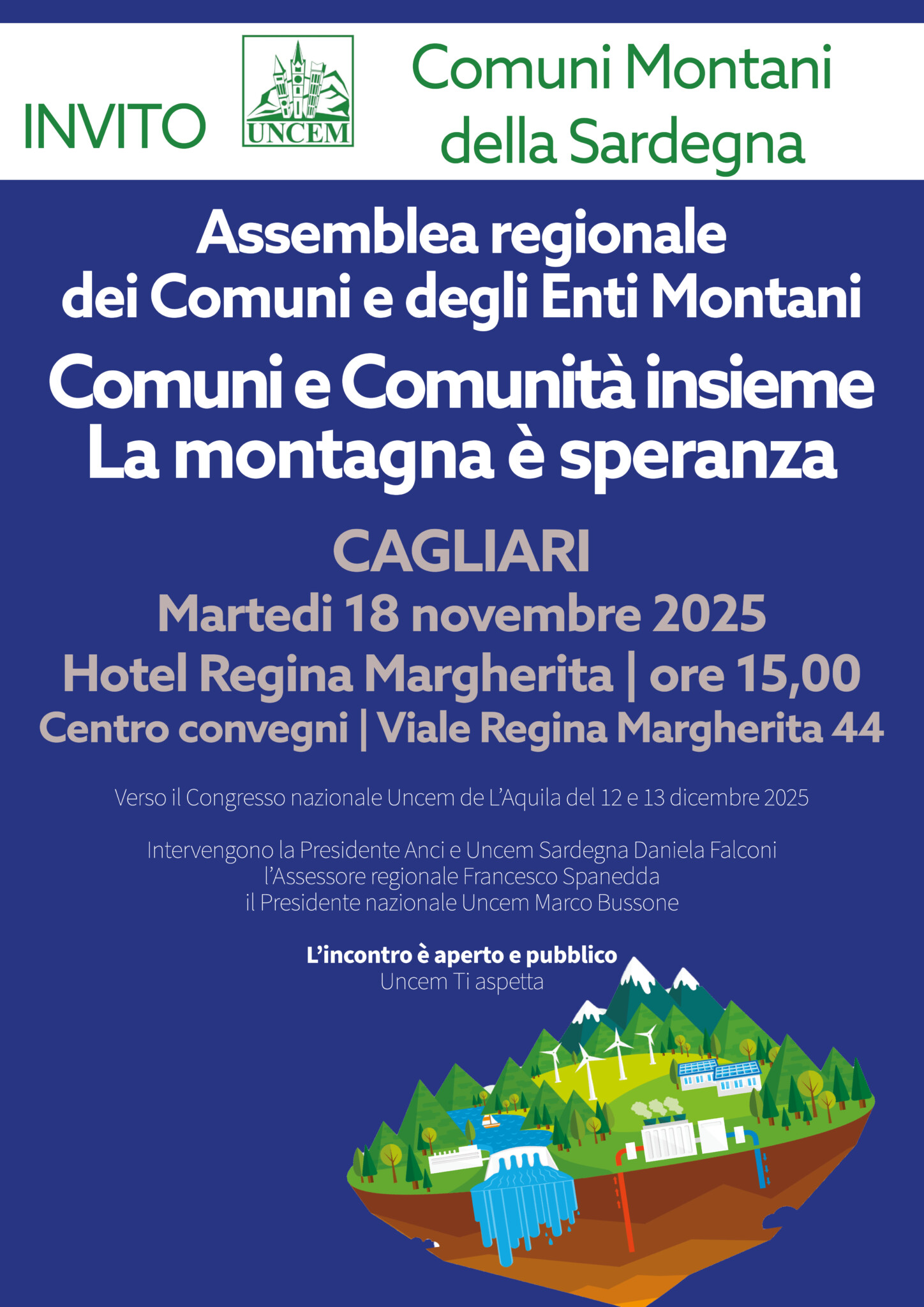 Appuntamento martedi 18 novembre, a Cagliari. Con “La Montagna è speranza”, ripeteranno Sindaci e Amministratori dei Comuni e degli Enti montani della Sardegna martedì 18 novembre a Cagliari. Alle 15 l’Assemblea regionale Uncem verrà ospitata nel Centro congressi dell’Hotel Regina Margherita. A coordinarla saranno Marco Bussone, Presidente nazionale Uncem, e Daniela Falconi che cinque anni fa era stata eletta Presidente di Uncem Sardegna prima di diventare anche Presidente Anci Sardegna. Le due associazioni degli Enti locali rafforzeranno collaborazioni e interazioni, in particolare nel dialogo con il Governo e il Parlamento – per evitare l’eliminazione di Comuni montani sardi dalla nuova prossima classificazione nazionale ai sensi dell’ultima legge montagna – e con la Regione. Al Congresso interverrà l’Assessore Francesco Spanedda, con il quale Uncem ha avviato ottimo percorso di interazione e collaborazione.