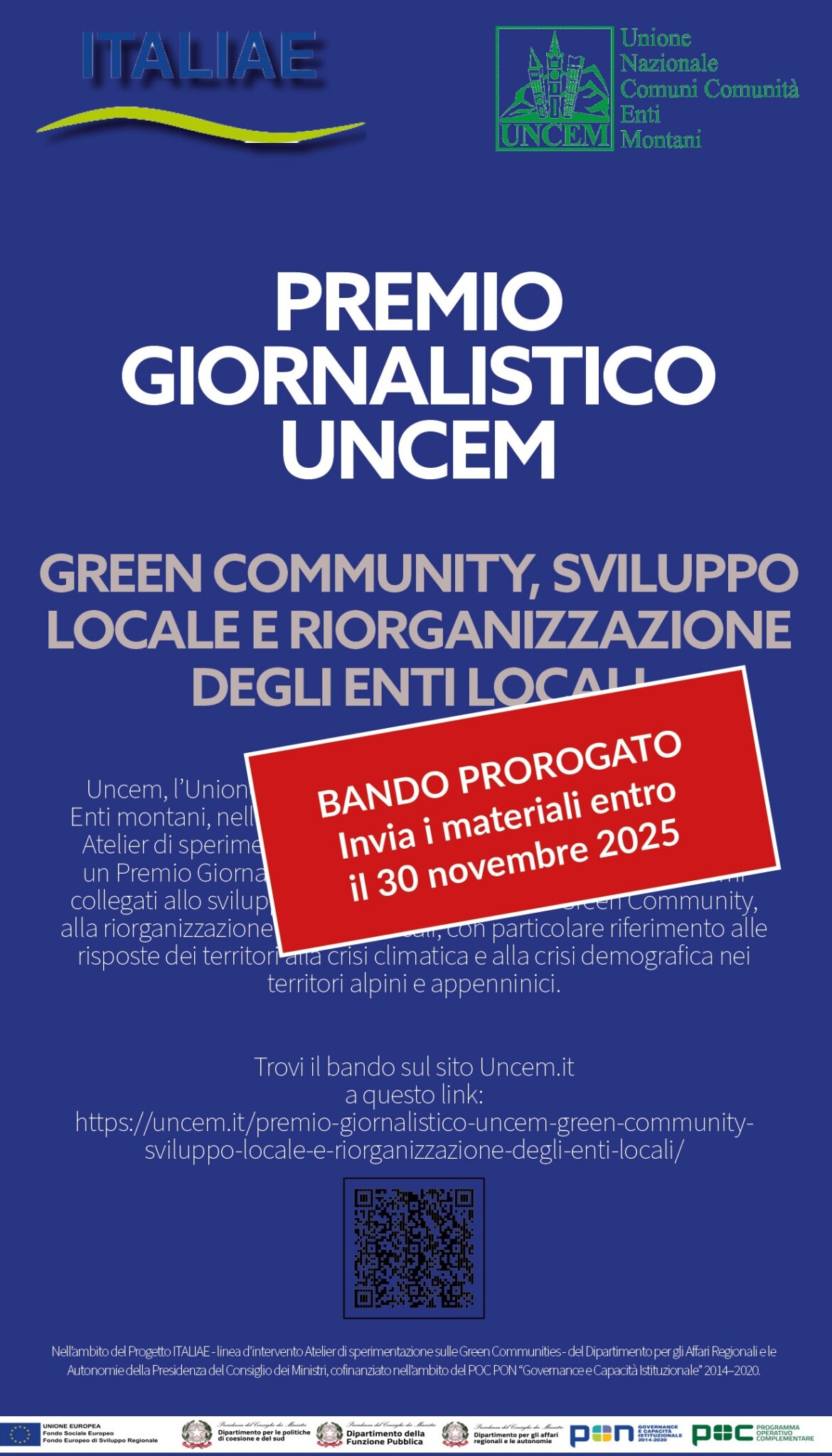 BANDO DEL PREMIO GIORNALISTICO UNCEM | PROROGA AL 30 NOVEMBRE 2025 28 ottobre 202528 ottobre 2025 Bando prorogato scaricabile in fondo alla news 1 allegato: UNCEM ITALIAE Premio Giornalistico ott2025 - con proroga 597 kB