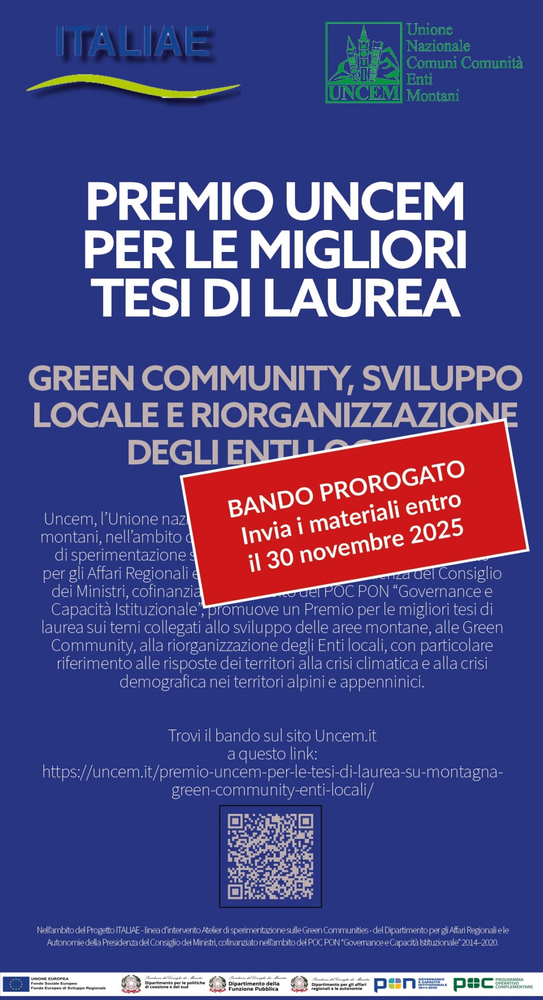 BANDO DEL PREMIO UNCEM PER LE TESI DI LAUREA| PROROGA AL 30 NOVEMBRE 2025 28 ottobre 202528 ottobre 2025 Bando prorogato scaricabile in fondo alla news 1 allegato: UNCEM ITALIAE Premio tesi laurea Green Communities mag2025 CON PROROG 587 kB