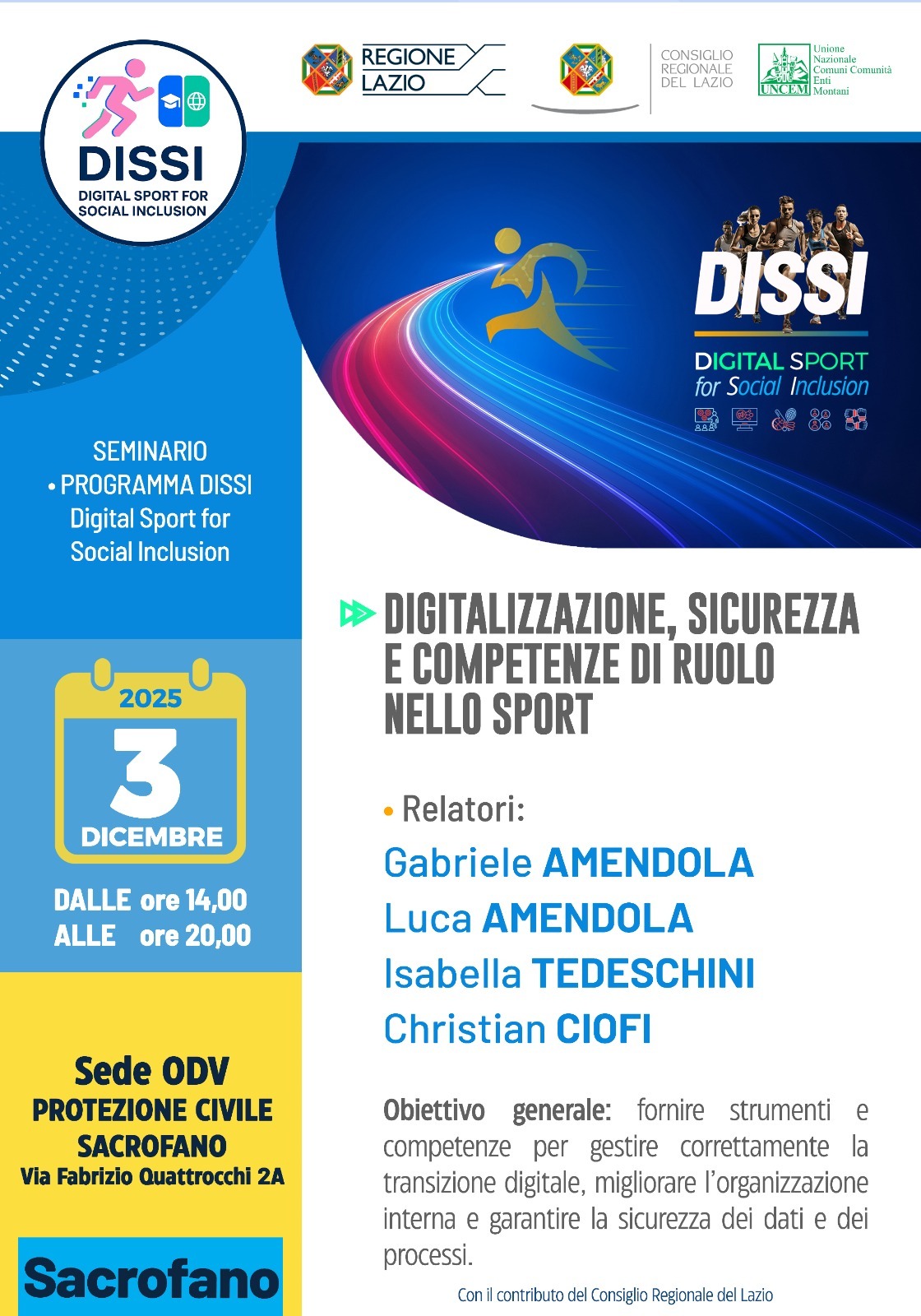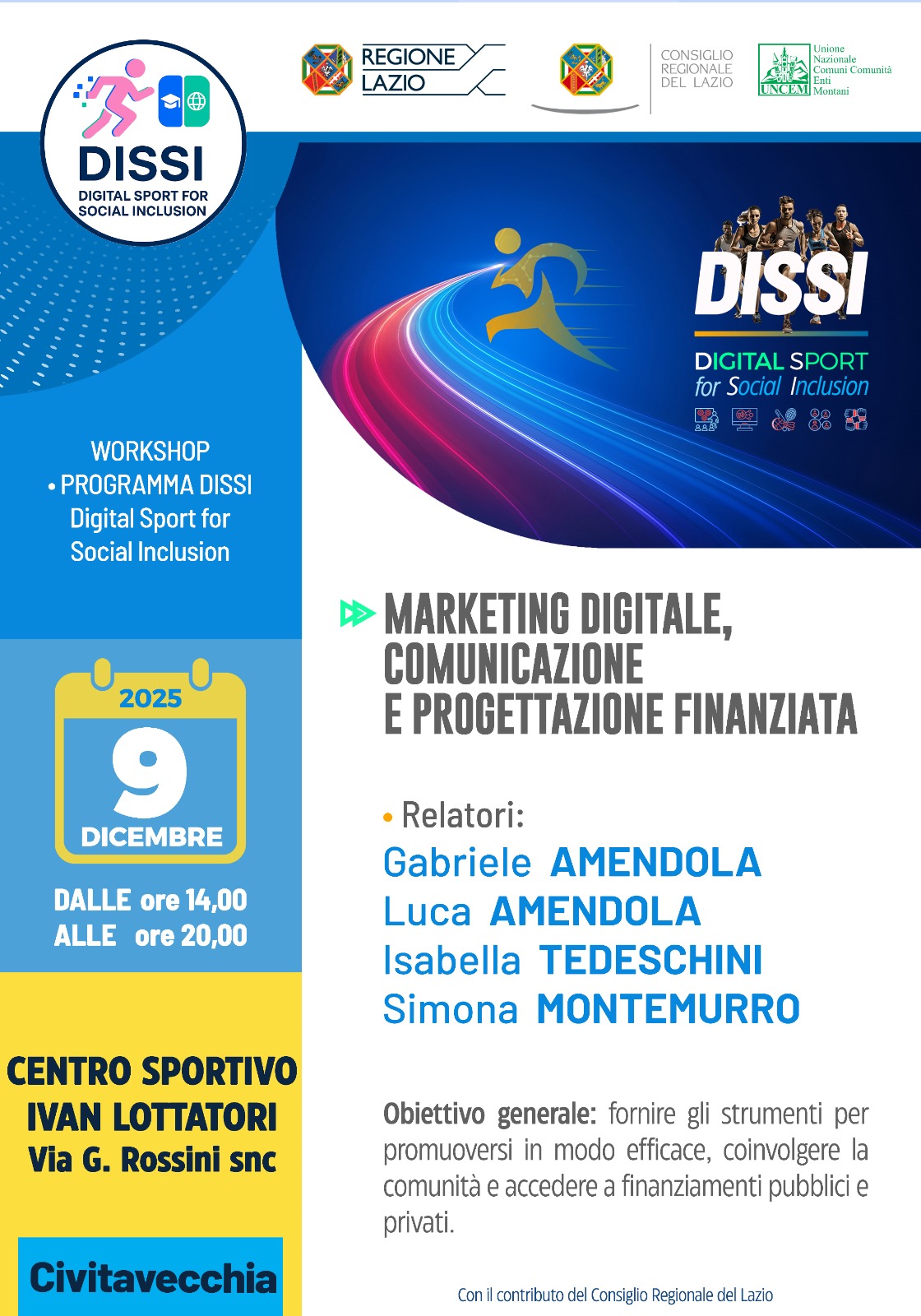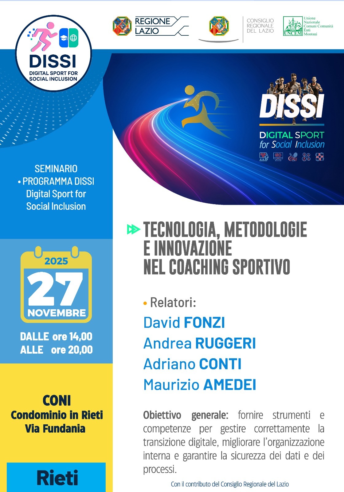 Parte da Rieti il progetto DISSI – DIgital Sport for Social Inclusion, guidato da UNCEM – Unione Nazionale dei Comuni, delle Comunità e degli Enti Montani e finanziato dal Consiglio Regionale del Lazio. Il progetto nasce per accompagnare le associazioni e società sportive dilettantistiche nella transizione digitale, rafforzando competenze, organizzazione interna e capacità di inclusione sociale attraverso lo sport. Il mondo sportivo di base si trova oggi ad affrontare sfide sempre più complesse: gestione amministrativa e normativa in continuo cambiamento, necessità di innovare modalità di allenamento e comunicazione, carenza di risorse economiche, difficoltà nell’agganciare i più giovani e nel mantenere una dimensione educativa e territoriale. DISSI interviene proprio su questi nodi, con un percorso concreto che unisce formazione sul territorio e strumenti digitali di supporto.