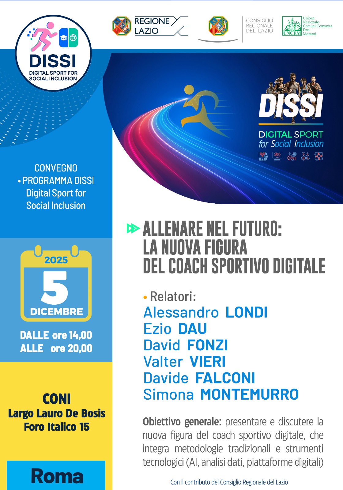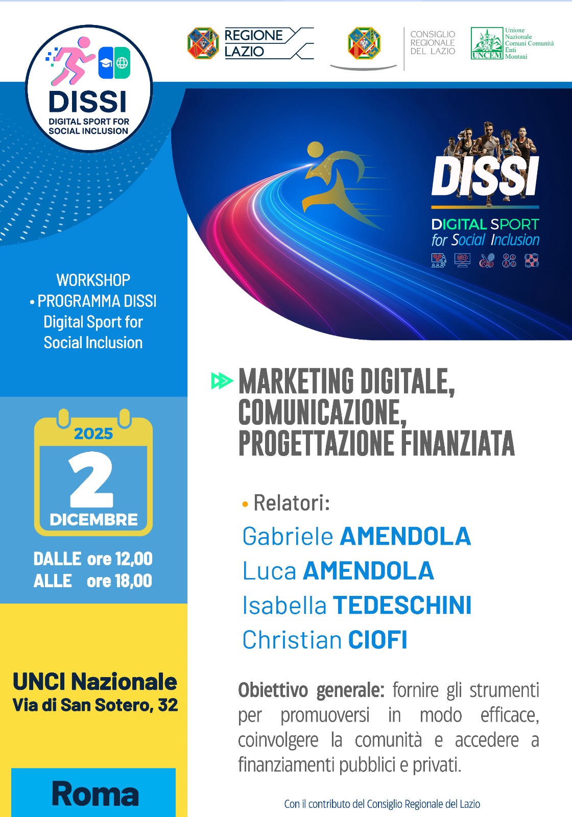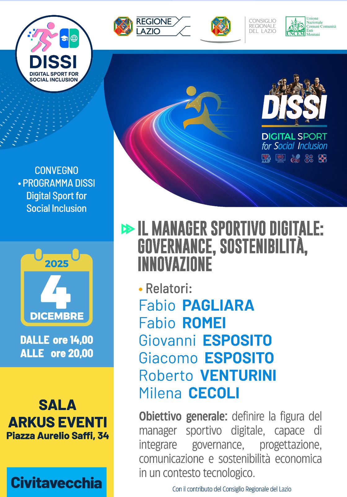 Parte da Rieti il progetto DISSI – DIgital Sport for Social Inclusion, guidato da UNCEM – Unione Nazionale dei Comuni, delle Comunità e degli Enti Montani e finanziato dal Consiglio Regionale del Lazio. Il progetto nasce per accompagnare le associazioni e società sportive dilettantistiche nella transizione digitale, rafforzando competenze, organizzazione interna e capacità di inclusione sociale attraverso lo sport. Il mondo sportivo di base si trova oggi ad affrontare sfide sempre più complesse: gestione amministrativa e normativa in continuo cambiamento, necessità di innovare modalità di allenamento e comunicazione, carenza di risorse economiche, difficoltà nell’agganciare i più giovani e nel mantenere una dimensione educativa e territoriale. DISSI interviene proprio su questi nodi, con un percorso concreto che unisce formazione sul territorio e strumenti digitali di supporto.